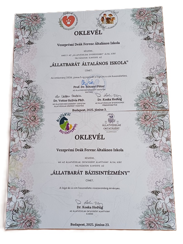 A közelmúltban iskolánk ismét elnyerte az „Állatbarát Általános Iskola” címet. Emellett intézményünk megkapta az „Állatbarát Bázisintézmény” címet is.
